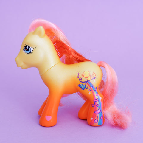 Morning Glory is an original My Little Pony Generation 3, Cutie Cascade Pony. Her cutie mark is a singing bird on a branch with music notes cascading on a rainbow down her leg.